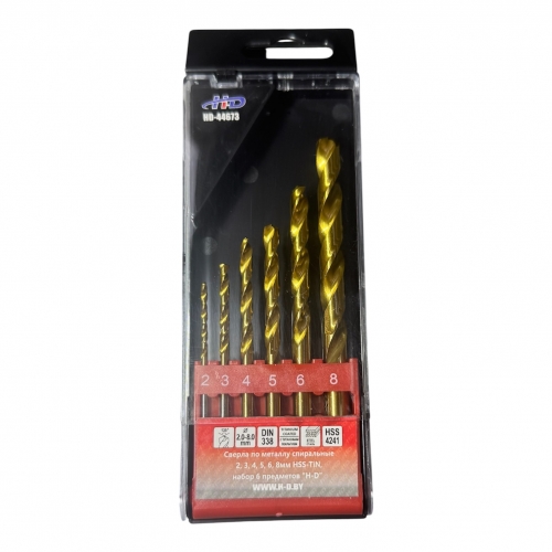 Сверла по металлу спиральные 2, 3, 4, 5, 6, 8мм HSS-TiN, набор 6 предметов HD-44673
